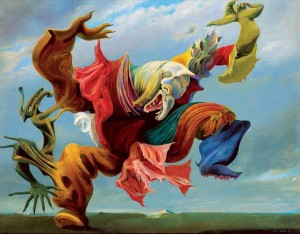 Pour autant, et même s’il vise « un au-delà de la peinture », Max Ernst n’a jamais cessé de peindre. Onirique, chimérique, fiévreuse et composite, sa peinture intègre et exploite toutes ces explorations parallèles. Elle navigue entre le conscient et l’inconscient, mêle l’organique à l’inorganique, marie l’inconciliable et hybride les règnes entre eux. En temps de guerre, elle livre des visions de paysages après catastrophe, mondes engloutis, forêts hantées, palais écroulés, personnages fossilisés, plantes carnivores et crépuscules fantomatiques. Et en temps de paix, elle se fait jardin enchanté peuplé d’oiseaux, d’insectes et autres créatures improbables et facétieuses, d’efflorescences merveilleuses, de concrétions et cristallisations magiques ouvrant sur des cosmogonies fantasmagoriques. « Mon œuvre, résume-t-il, est à la fois une sorte d’appel à l’enfantillage et le désir de créer un univers pictural à la mesure de la situation tragique de l’homme aujourd’hui. »