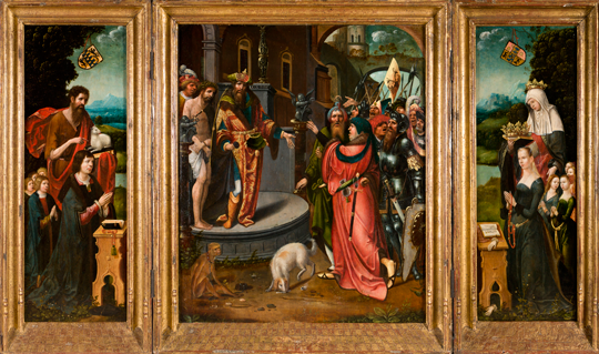 Cette galerie, spécialisée dans la peinture nordique du XVIIe siècle, a déniché, cette année, un triptyque d’un certain van Overbeke, qui constitue l’une des seules peintures flamandes antérieures au XVIIe siècle présentées au salon cette année. Il faut dire qu’elles sont si rares ! Les deux volets articulés découvrent un panneau central représentant un Ecce Homo, cet épisode biblique au cours duquel le Christ est présenté au peuple de Jérusalem par le préfet romain Ponce Pilate. On est ici vers 1515, à un moment charnière de l’évolution de l’art flamand, qui balance peu à peu dans la Renaissance, mais ce retable est peu redevable à l’art italien. Il se rattache encore au style des primitifs flamands, expressif – notez la physionomie caricaturale des bourreaux – et coloré malgré l’intégration de certains éléments décoratifs issus du répertoire Renaissance. La composition chatoyante est encore assez rigide notamment, avec des groupes compacts de personnages, ce qui n’enlève rien à la beauté de l’œuvre, bien au contraire.