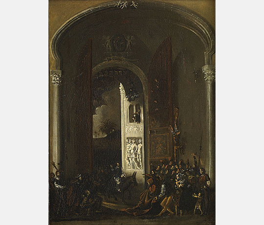 Terminons la tournée des galeries du palais de la Bourse par un florilège rapidement brossé, comme une esquisse du XVIIIe siècle, des autres perles à mettre au collier de Paris Tableau cette année : chez Eric Coatalem, Lubin Baugin montre ses figures porcelainées et maniérées dans une belle Sainte Famille dont les personnages occupent tout l’espace de la toile, un caravagiste italien, Orazio Riminaldi, peint Clovis, la main posée sur le vase de Soissons, tel un roi biblique chez G. Sarti, probablement pour un Français installé à Rome et un dénommé Velazquez, dont le prénom n’est pas Diego mais Eugenio, un homonyme du XIXe siècle, se prend ici non pas pour le maître de Séville mais pour Murillo et Goya en peignant lui aussi des majas regardant par la fenêtre (La Loge, 1850, galerie Terrades). Manet, plus tard complétera la série avec Le Balcon, au musée d’Orsay. Chez Canesso, l’étrange François de Nomé (un Lorrain du XVIIe siècle installé à Naples), inspiré par les paysagistes nordiques, représente L’entrée du Christ à Jérusalem dans une veine miniaturiste. Etrange, cette scène l’est par son inscription nocturne dans un cadre architectural fantaisiste et oppressant, celui d’une grande porte, celle de la ville de Jérusalem, qui épouse parfaitement le cadre du tableau et contient toute la scène, avec l’assemblée grouillante de petits personnages observant l’arrivée du Christ.