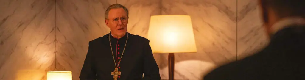 Entrer dans Conclave, par-delà ses soutanes et son polyglottisme semblant rappeler que les enfants de Dieu ne parleront jamais tous la même langue, c’est enfin pénétrer dans un décor claustrophobe et sublime – à l’image de la foi. Tourné à Rome, dans les studios de Cinecittà, l’œuvre plonge le spectateur dans un dédale de marbre, de rideaux et de couloirs sculpturaux, muant en objet kubric- kien ce Vatican intemporel. La décoratrice a laissé primer son intuition sur le réalisme : « Je voulais que le décor donne le sentiment d’être une prison de luxe. Les portes évoquent la prison. Les fenêtres sont obstruées par des volets rarement ouverts. » Pour oblitérer, sans doute, le plus incandescent secret de l’Église, bien plus ancien que ces bagarres de gladiateurs en robes rouges, plus ancien qu’Hol- lywood même: la place de la femme dans ce mon- de pensé par des hommes, régenté par des hom- mes. Mais nous en disons trop : laissons le script venir à bout de ses messes basses.
