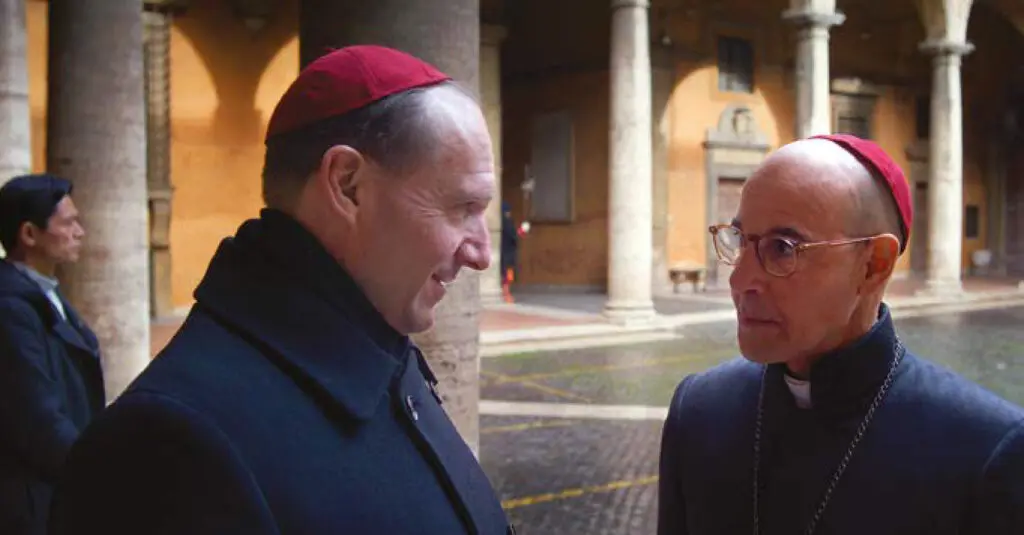 Sous ses atours de divertissement de luxe, Conclave soulève tout de même une éternelle question, aussi antique que la philosophie grecque: l’exercice du pouvoir saurait-il être moral quand de cyniques qualités de stratège sont exigées pour l’acquérir ? Par extension, si comme le pensait Churchill, la démocratie se révèle le système « le moins mauvais de tous », faut-il pénaliser un candidat aux idées rétrogrades mais aux méthodes régulières, face à un intrigant progressiste ? Autant d’énigmes qui habitent le film, et ébranlent la foi du Cardinal Lawrence, le Doyen du Collège qu’incarne un Ralph Fiennes d’un intensité, d’une intériorité inouïes. Ses apartés avec Stanley Tucci, dans le rôle du Cardinal Bellini, restent de grands moments. Face aux manœuvres indignes de ses pairs, « com- ment Lawrence peut-il croire en l’avenir ? », interro- ge le réalisateur. « Trouver un sens à sa vie? Autant de questions que la plupart des gens, et pas seulement les hommes d’église, se posent très souvent ».