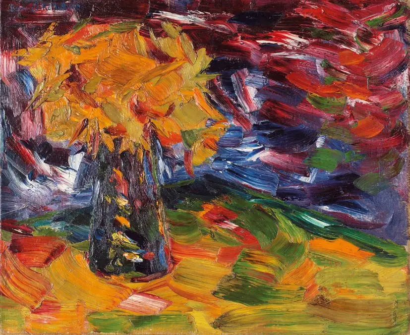 On retrouvera au fil de l’exposition des figures-clés du courant allemand. Parmi elles, Gabriele Münter (1877-1962), adhérente de la première heure au mouvement, fidèle à une esthétique fondée sur la géométrie des formes et un usage presque insolent des couleurs qui la rapproche de l’esthétique des Fauves, actifs au même moment en France, Emil Nolde (1867-1956) ou Karl-Schmidt Rottluff (1884-1905), figure plus discrète du mouvement dont on peut admirer son Bouquet jaune. Une œuvre peinte à ses débuts, avec vitalité et nervosité où s’entremêlent les teintes rouges, jaunes, vertes, bleues qui n’est pas sans rappeler la peinture enflammée de Vincent van Gogh, une influence majeure. L’empâtement de la toile rend le motif presque illisible et tire vers l’abstraction.