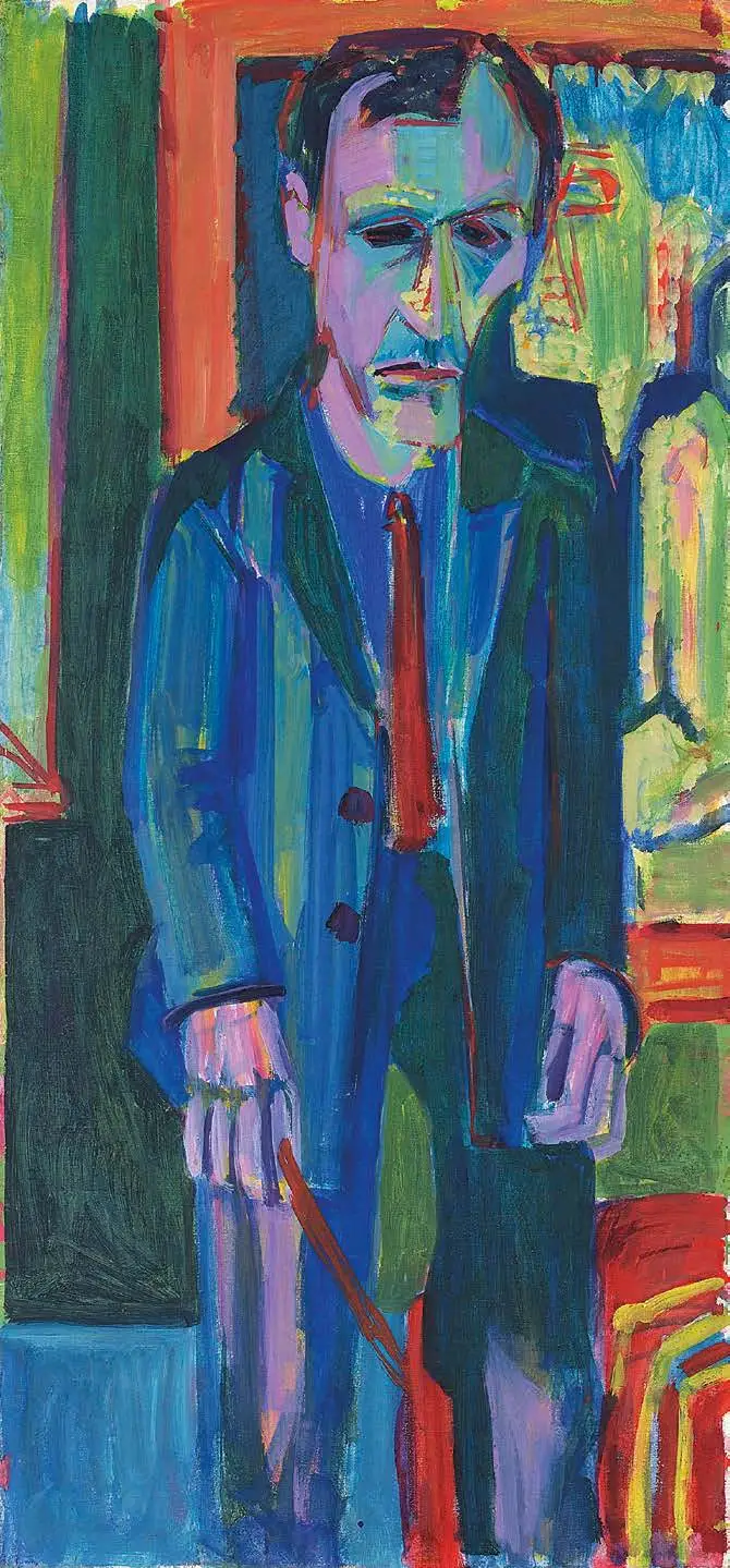 Le portrait que fait justement Albert Müller (1897-1926) en 1925 de son ami Hermann Scherer, longue silhouette voûtée au visage allongé envahissant l’espace du tableau, scelle une amitié entre les deux membres fondateurs de Rot-Blau. Kirchner lui-même avait pris les deux amis artistes pour modèles dans sa sculpture presque grandeur nature intitulée Les amis (Die Freunde) l’année précédente. En 1925, pourtant, l’amitié de dix ans qui liait les deux hommes prenait fin lors de la première exposition du groupe Rot-Blau, les ambitions et la jalousie ayant mis leurs rapports amicaux à mal. Müller décède jeune, en 1926, à l’âge de vingt-neuf ans victime du typhus, mettant un point final à une courte carrière achevée sous l’influence marquée de Kirchner.