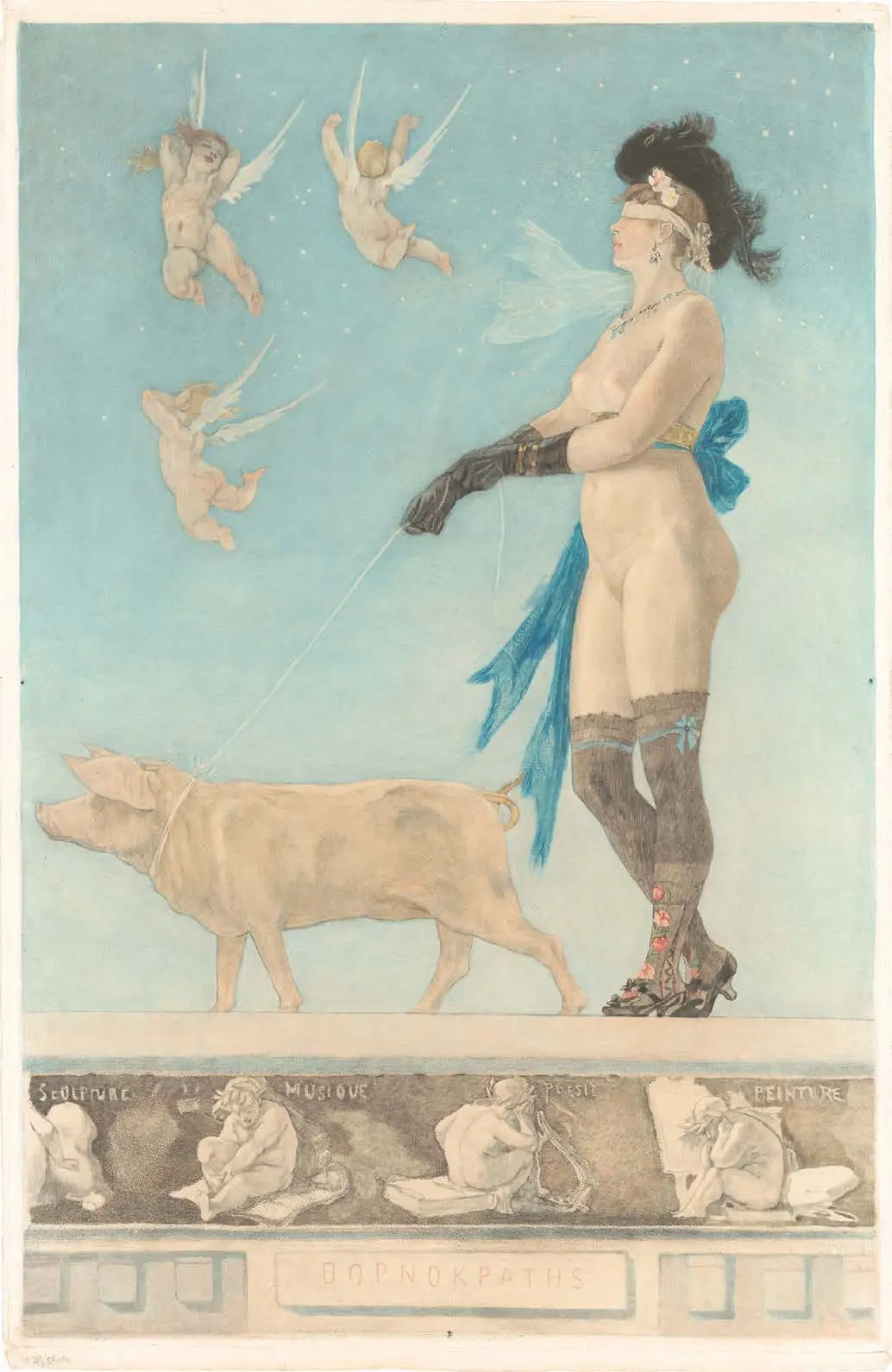 Devant Pornocratès, l’image paraît familière: une femme nue, les yeux bandés, guidée par un porc doré. On l’a souvent réduite à une satire de l’argent-roi ou à une charge contre la morale cléricale. Mais face à l’original, la scène gagne en complexité. La figure avance avec assurance. Elle ne semble ni victime ni caricature. Le bandeau ne la fragilise pas; il la rend presque souveraine. Il déplace la question vers celui qui regarde. Qui est réellement exposé? La femme représentée ou le spectateur confronté à son propre désir?