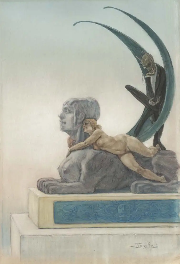 Le Sphinx prolonge cette tension. Beauté hiératique, présence silencieuse. La figure de la femme fatale, emblématique de la fin de siècle, incarne à la fois attraction et menace. Rops critique la morale bourgeoise, mais il ne s’en extrait jamais totalement. Il travaille avec ses symboles, ses fantasmes, ses peurs. Cette ambiguïté est essentielle. Elle empêche toute lecture simplificatrice. Elle maintient l’œuvre dans une zone d’instabilité féconde.