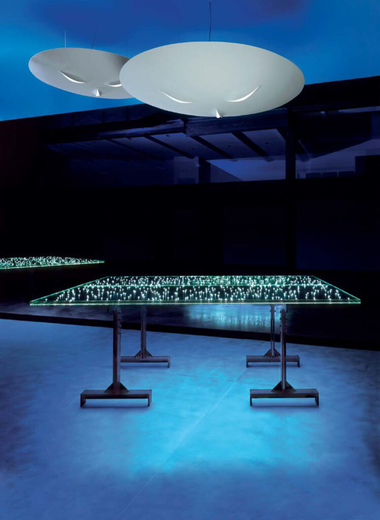 La «designerie» étoilée S’il aime Brancusi, il apprécie aussi Calder. «L’homme qui donne libre cours à ses sentiments plutôt qu’à son intellect» rejoint sa philosophie, tout comme la phrase du poète japonais Ori: «Il te faut nettoyer ton esprit, chaque jour, jour après jour». Paul Matisse, Paul Klee, Pablo Neruda, Bella Abzug, porte-drapeau du Women’s Liberation, font partie de ces personnages qui inspirent Ingo Maurer, lui donnent de l’énergie.Ce libre-penseur ne pouvait faire à moins de développer et produire lui-même ses créations dans sa manufacture de Munich où s’affairent environ soixante-dix personnes. Un fait rare dans l’univers du design, qui révèle autant la fascination du créateur pour les composants techniques et leur esthétique que son attrait inépuisable des technologies très novatrices et des matériaux simples. Son secteur de recherches et développement, «la designerie» comme il la nomme, lui permet d’être souvent en avance sur son temps. Comme la lampe halogène a révolutionné la qualité formelle des luminaires dans les années 80, les LED, ces diodes minuscules qui répandent des myriades d’étoiles, sont déjà l’avenir chez Ingo Maurer. Parmi les premiers à reconnaître ce potentiel, il y a dix ans déjà, l’homme continue de nous surprendre avec ses nouvelles évolutions expérimentales. Avec lui, le panneau suspendu El.E.Dee, ses table et banc en verre feuilleté relèvent de la haute technologie entrée en art. L’art de quelqu’un qui a tout donné, tout dit, et doit le dire encore.