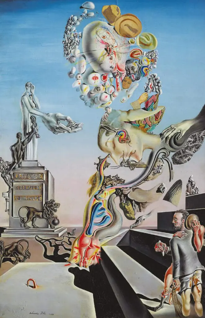 Il faut avouer que cette peinture, pour peu qu’on la regarde de près, est à la limite de l’insoutenable. La critique a noté ce qu’elle devait à Giorgio De Chirico. Mais l’univers de Chirico ne soulève pas le cœur comme le fait ici Dalí : des entrailles, et leur contenu, d’autres matières douteuses ou ignobles voisinent avec un escalier monumental, aux lignes bien droites, ainsi qu’une sorte de pié- destal aux arêtes non moins nettes. Au-dessus d’un sol ferme et sur fond de ciel pur, flottent le mou, l’informe, le visqueux.