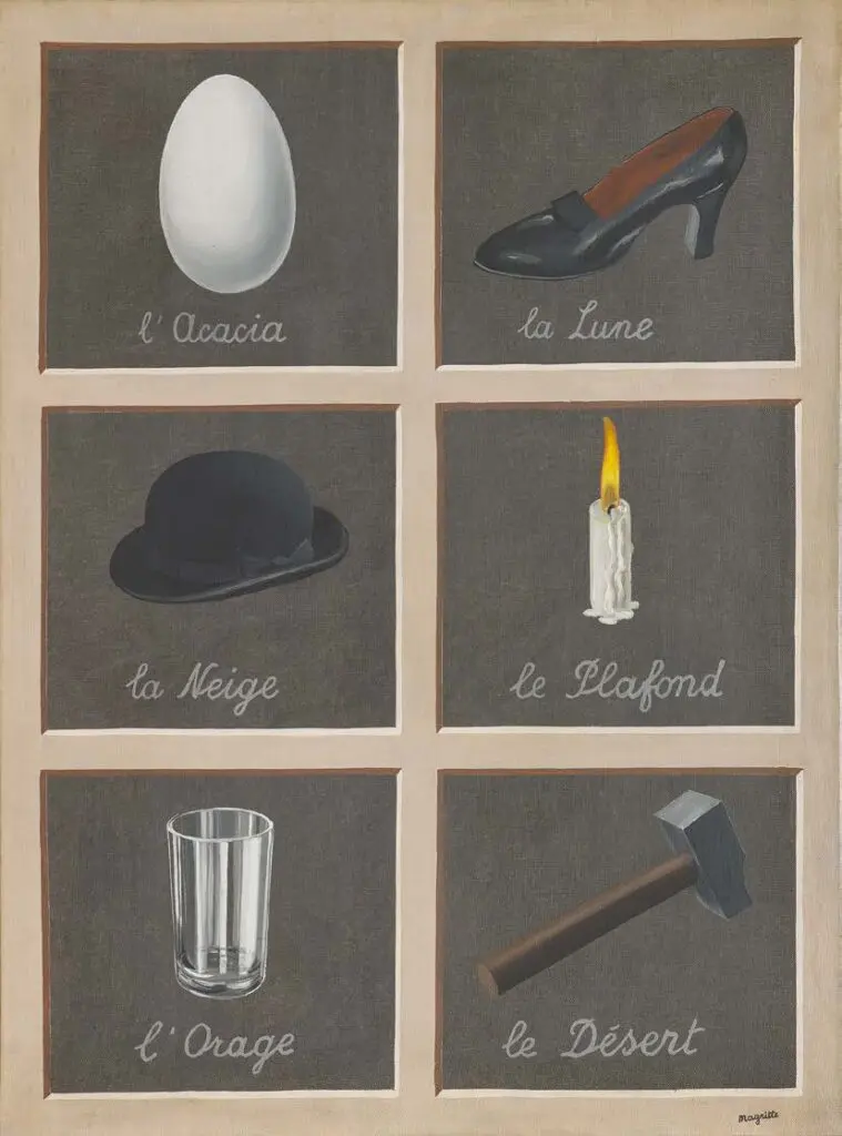 La Clé des songes de René Magritte apparaît rafraî- chissante après une telle épreuve. Chez cet artiste, le surréalisme rejoint avec délices les parages de l’absurde, et le rire est le bienvenu. Bien sûr, on peut soumettre La Clé des songes à mille interpré- tations savantes sur le rapport entre les mots et les choses. On peut rappeler que les associations iné- dites et inattendues (dont l’exemple le plus simple est le « cadavre exquis ») sont, pour le surréalisme, révélatrices des arcanes de notre psyché. Mais on peut aussi se contenter de sourire devant cette fe- nêtre à six carreaux, ces mots soigneusement cal- ligraphiés, comme dans le cahier d’un écolier qui recopierait sagement les expressions d’une douce folie.