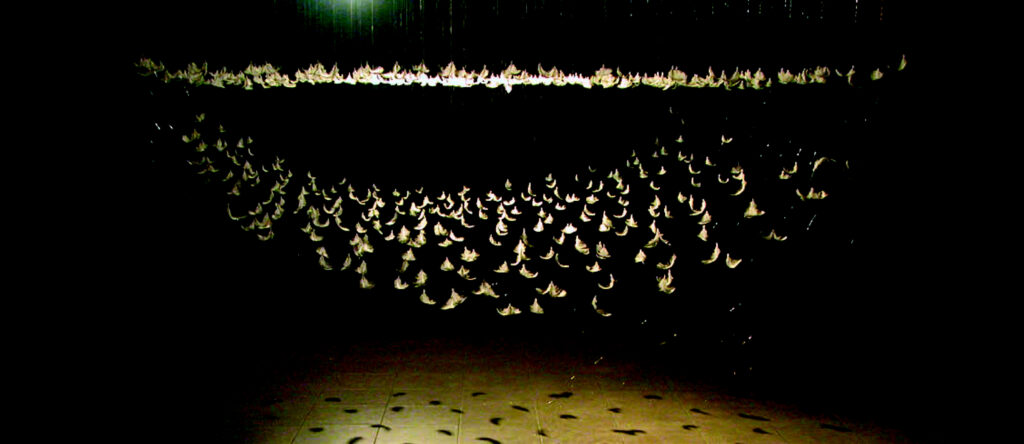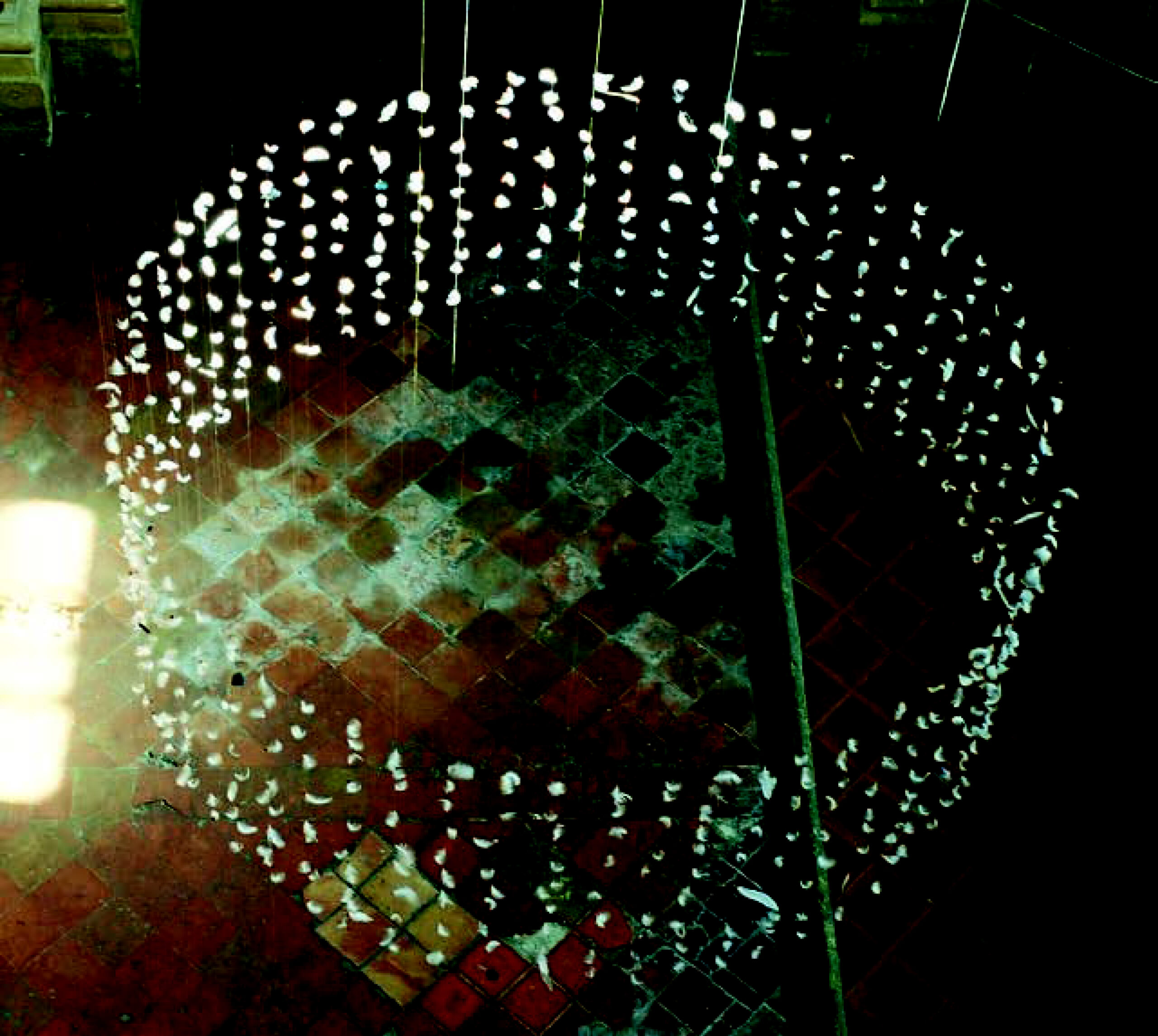 Plumes de goélands, fils, cire Diamètre: 140 cmProfondeur: 27 à 100 cm du sol Studio d’Arte Harry Zellweger, Lugano