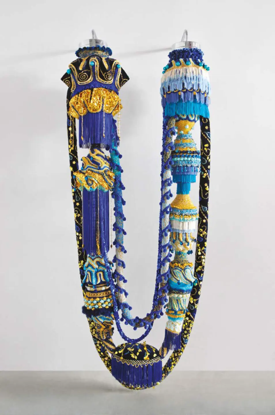 Complètement artisanal, le lustre a été réalisé par l’atelier de couturières et de tricoteuses de l’artiste à Lisbonne comme la plupart de ses pièces, des superbes Cœurs indépendants coulés avec des couverts en plastique aux géniales Valkyries géantes en tissus et broderies, telle celle qui a couronné l’édition 2024 de la Foire Artgenève. Sculpture inspirée de figures féminines de la mythologie nordique, qui survolaient les champs de bataille pour ressusciter les guerriers les plus braves, cette œuvre se veut un message de force et de résilience. Réalisée à partir d’une variété de textiles, caractérisée par une palette chromatique éclatante, toute Valkyrie pré- sente un mélange surprenant de volumes, de textures et de couleurs, combinant une fois encore l’artisanat traditionnel – franges, perles, fourrures, pompons – et les techniques contemporaines – sequins, lumignons – dans une souveraineté aussi sensuelle qu’inquiétante. La pièce présentée dans la Cité de Calvin à l’initiative de sa galeriste genevoise Laura Gowen comptait dix-sept mètres d’envergure, neuf mètres de hauteur et quelque huit cent quatre-vingts kilogrammes. Baptisée Valkyrie Mumbet, cette pièce rendait hommage à Elizabeth Mumbet Freeman, première esclave afro-américaine à avoir gagné sa liberté par voie légale en 1781.