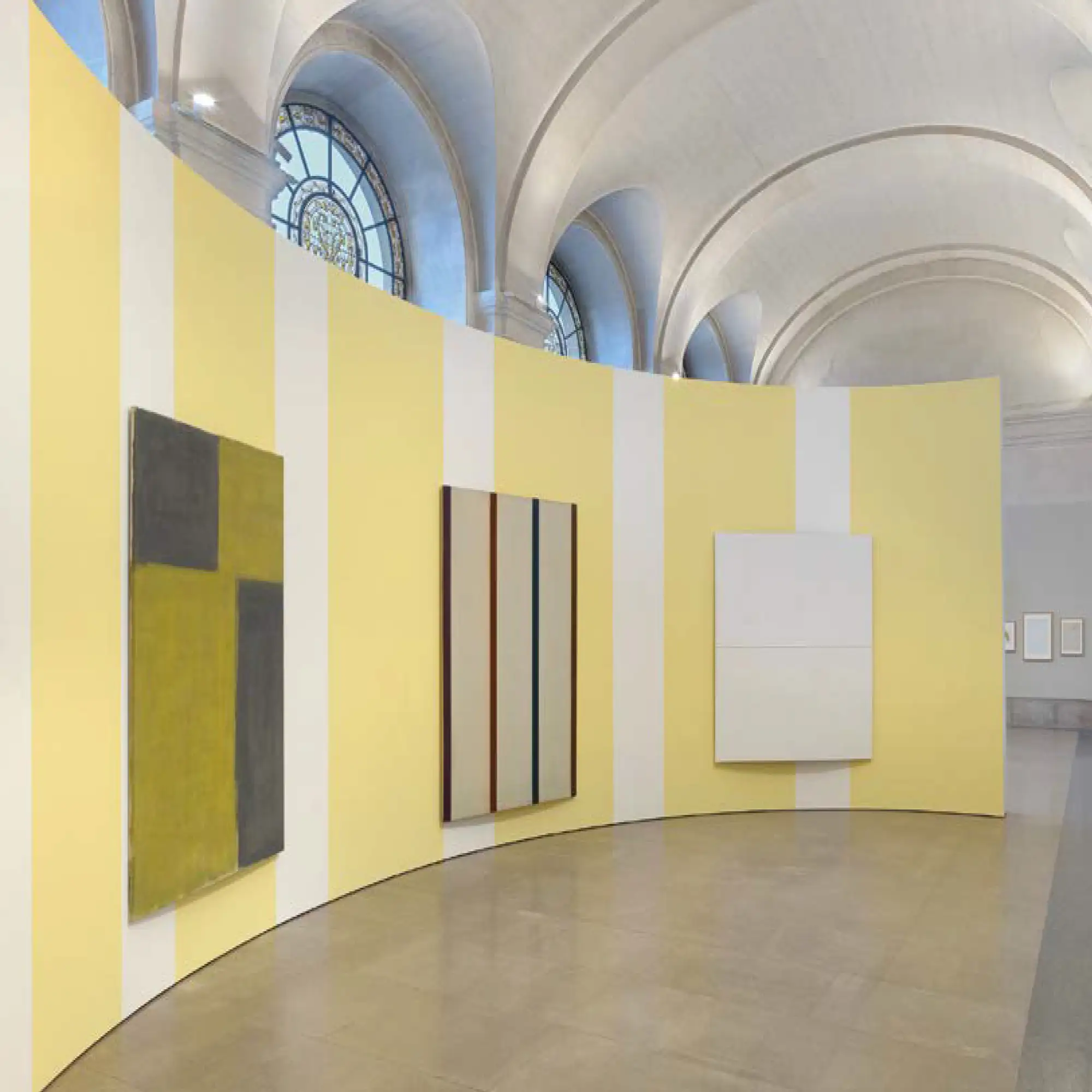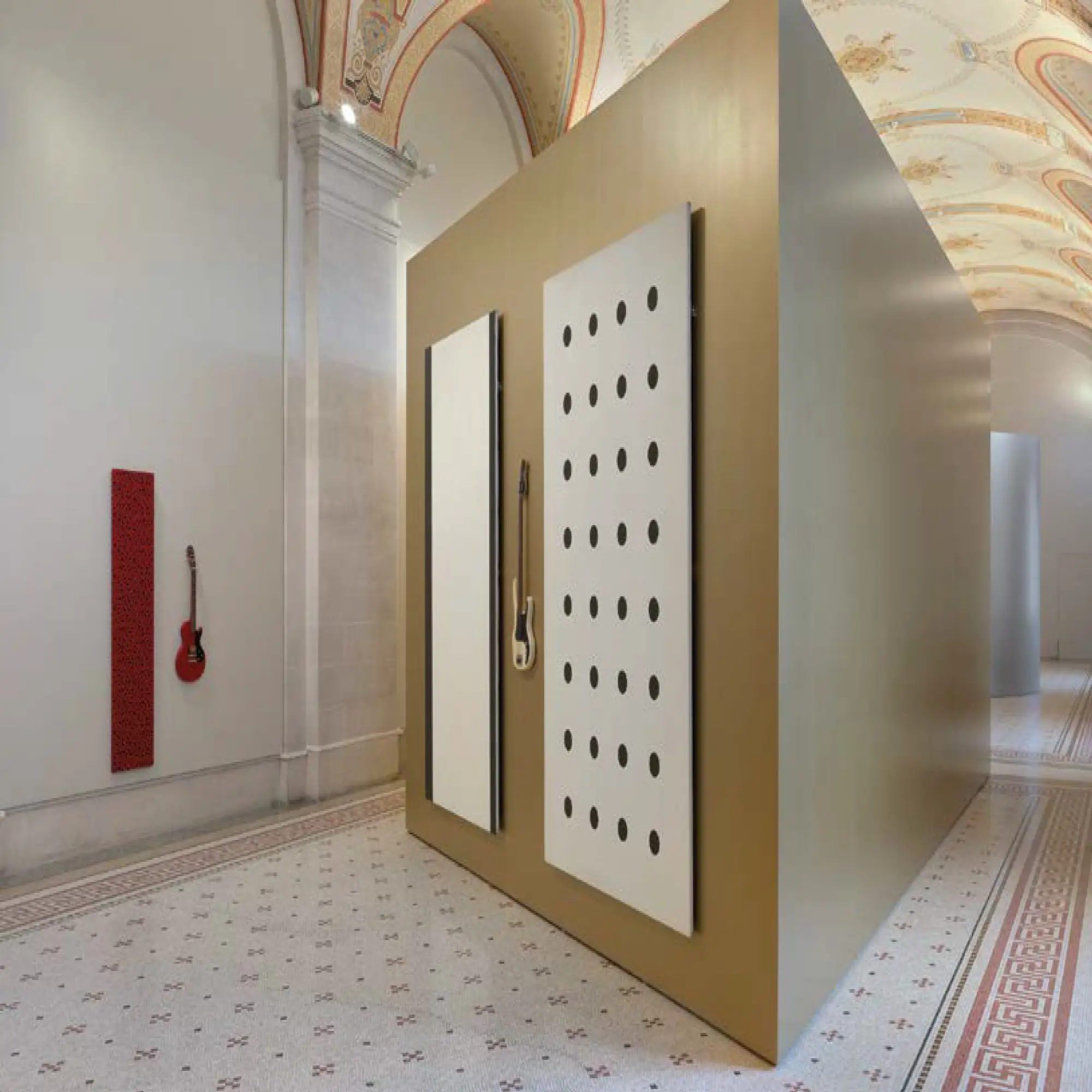 Avec des airs à la Buren, recouverte de bandes verticales jaunes et blanches, une paroi, incurvée comme les voûtes du rez-de-chaussée, se fait écrin pour la peinture abstraite de Helmut Federle, Pierre Haubensak ou Olivier Mosset. «N’importe qui peut faire un Rembrandt, un Vermeer ou un Picasso, voire même un Armleder, mais n’importe qui ne l’a pas fait», rappelle celui qui nous propose à grands pas un accrochage de l’histoire de l’art moderne. Plus loin, des bouquets rehaussés de cadres dorés côtoient de fausses orchidées fichées dans des pneus de camion. Aménagement d’intérieur versus aménagement urbain, le kitsch pour trait d’union. On retrouve aussi de grands murs dorés comme ceux du passage Montbrillant, à la gare Cornavin, réalisés en 2018 pour accueillir le tramway 14. Mais, ici, il s’agit de présenter des instruments de musique à côté de peintures formellement inspirées de leur forme, faisant d’une guitare électrique – icône populaire, objet culte dans le milieu du rock – une peinture, plaçant le public devant le miroir que Christian Marclay a glissé au fond d’un piano à queue, incitant à de nouvelles circulations de sens, provoquant des échanges entre les valeurs du symbolique et de l’utilitaire, l’entrelacs des relations entre les objets d’art et leur décor.
