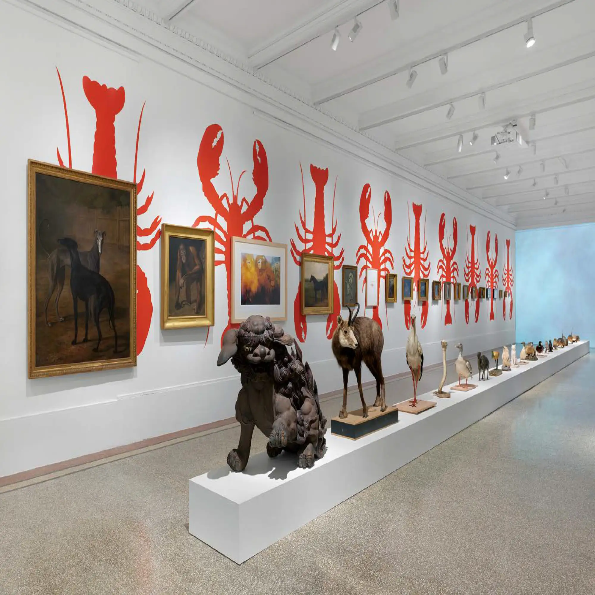 Aussi dense que varié, l’enchaînement nous fait passer d’un amas de néons disposés comme un jeu de Mikado géant à des peintures murales de poulpes et de homards, en passant par des portraits montés en escalier, sans omettre une petite vitrine de timbres-postes représentant des papillons. À chaque fois, la répétition amène un rythme, ainsi un objet devient souvent motif, ce qui le charge d’un caractère décoratif indéniable. L’univers décomplexé et haut en couleurs de John M. Armleder offre peut-être une surenchère d’objets, de codes et de références, mais, soudainement, un moment suspendu invite à prendre une respiration: des cloches en verre ne recouvrent rien, de l’air tout au plus. Non moins essentiel que le célèbre couple yin-yang, le vide se présente, on le sait, comme un pivot cardinal dans le fonctionnement de la pensée orientale, et ici dans la déambulation muséale. Point culminant, un promontoire de tubes d’échafaudage s’érige au milieu de la salle des armures. À moins que ce ne soit la salle des fêtes. Car le geste le plus radical de cette fête annoncée dès l’entrée du musée, c’est la dissimulation totale des hallebardes, casques ou boucliers au profit d’une draperie argentée surpiquée de cadres dorés. Un air baroque pour faire taire ce qui alimente le souvenir des guerres, réminiscence d’un passé qui aujourd’hui redevient trop actuel.