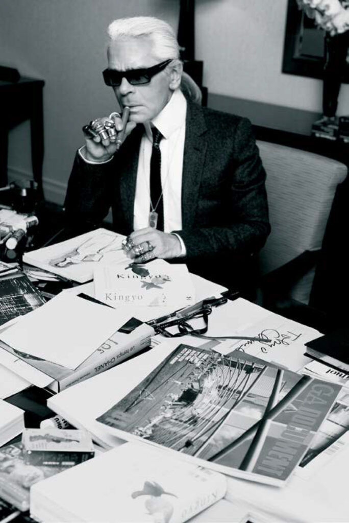 1938– Naissance à Hambourg 1952– Arrivée à Paris. 1955– Remporte le premier prix ex æquo avec Yves SaintLaurent du concours organisé par le Secrétariat général de la laine. Entre chez Pierre Balmain. 1958– Devient responsable de la couture chez Jean Patou. 1959– En free lance, travaille pour Valentino, Charles Jourdan, Krizia, Chloé… 1964– Devient le directeur artistique de Chloé (jusqu’en 1984) 1965– Entre chez Fendi comme consultant pour le prêt-à- porter. Quand la maison est rachetée par LVMH, son contrat est renouvelé. 1975– Création d’un parfum pour Chloé, Chloé (tubéreuse, ylang-ylang, rose, chèvrefeuille, jasmin, fleur d’oranger, vétiver, mousse de chêne, patchouli, musc, ambre gris). 1982– Création d’un nouveau parfum, K.L. 1983– Entre chez Chanel en tant que directeur de la couture et du prêt-à-porter 1984– Création de sa propre ligne, Lagerfeld. 1987– Commence à photographier ses propres collections et ses campagnes de publicité. 1992– Nouveau parfum, Narcisse. 1994– Publie «Mes plus belles photos» Hachette littérature. Publication de Off the record chez Scalo Verlag 1996– Publication de Visionnen chez Steidl/interart. 1997– Fin de la ligne Lagerfeld. 1998– Création de la Lagerfeld Gallery, rue de Seine à Paris. Publication de Casa Malaparte chez Steidl/ interart. 1999– Ouverture de la librairie 7L , rue de Lille à Paris. Publication de Tadao Vitra house chez Steidl/interart. 2000– Création des Editions 7L. Métamorphose spectaculaire du personnage: il perd 42 kg et publie Le Meilleur des régimes (Robert Laffont). 2001– Publication de Abstrackt chez Steidl/interart. 2002– Publication de Waterdance bodywave chez Steidl/ interart. Et de Portfolio ed. Te Neues Gb. 2004– Sortie de la ligne Karl Lagerfeld pour H&M. Publication des Vases de Ciboure chez Steidl/interart. 2005– Publication de Back stage and front row chez Steidl/interart. 2006– Publication de 7 fantasms of a woman chez Steidl/interart.