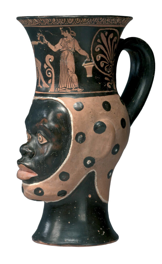 Pour représenter les hommes de couleur, les Anciens ont créé un type fixe, sans distinguer les caractères somatiques correspondant aux différentes races, car ils manquaient de connaissances exactes du continent africain. Le Noir se trouve donc caractérisé par sa peau sombre, son nez court, large et épaté, ses lèvres épaisses et proéminentes, ses cheveux crépus, à l’exclusion de tout autre signe particulier. Les Grecs parlaient des Noirs sous le nom d’Ethiopiens, qui signifie étymologiquement «Hommes à la face brûlée par le soleil».