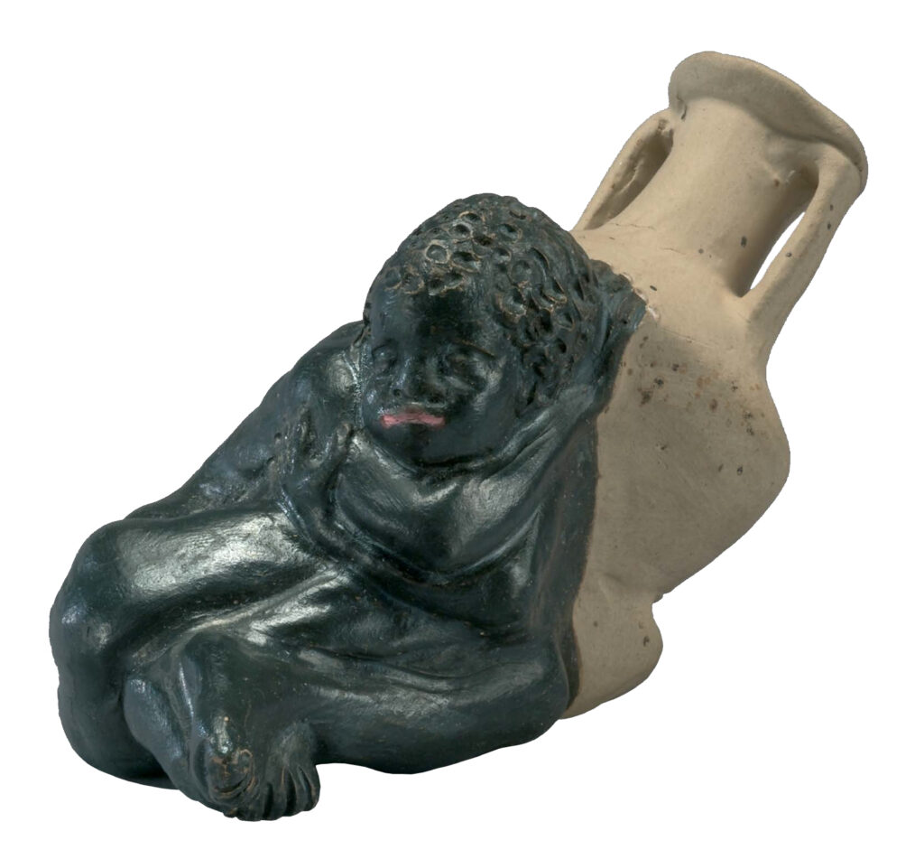 3. Petite sculpture, entièrement creuse, faisant office de flacon. Elle représente un jeune Noir endormi, appuyé sur une amphore. Celle-ci est soutenue en position inclinée par quatre gros cailloux. On peut voir dans ce garçon un esclave affecté au déchargement d’un navire, rempli d’amphores. Epuisé, il sommeille pendant la pause, à l’abri du soleil de midi.Ce vase miniature, originellement muni d’un bouchon, contenait du parfum, sous forme huileuse. Le sujet de la représentation, typiquement alexandrin, avait valeur d’étiquette, de marque d’origine, Alexandrie étant réputée pour son industrie cosmétique.