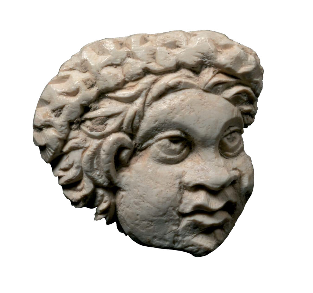 5. Plaquette en ivoire ou en os, ayant décoré une pièce d’ébénisterie, boîte à cosmétiques ou coffret à bijoux. L’objet esten forme de tête, figurée de trois quartset exécutée en bas-relief. Le personnagequ’on a devant les yeux est clairement désigné comme un Africain: joues rondes,nez aplati, lèvres épaisses, cheveux drus. Ilporte une couronne de fleurs, car dans lesbanquets et les fêtes religieuses les serviteurs aussi avaient droit à cet ornement.