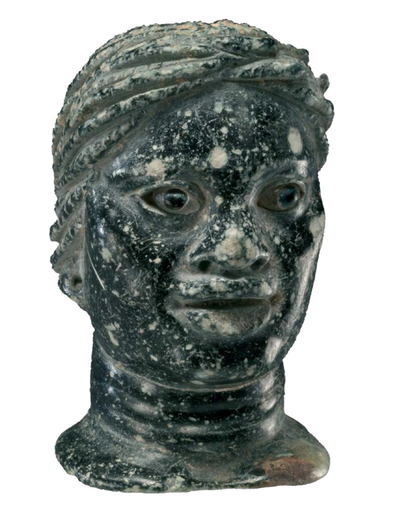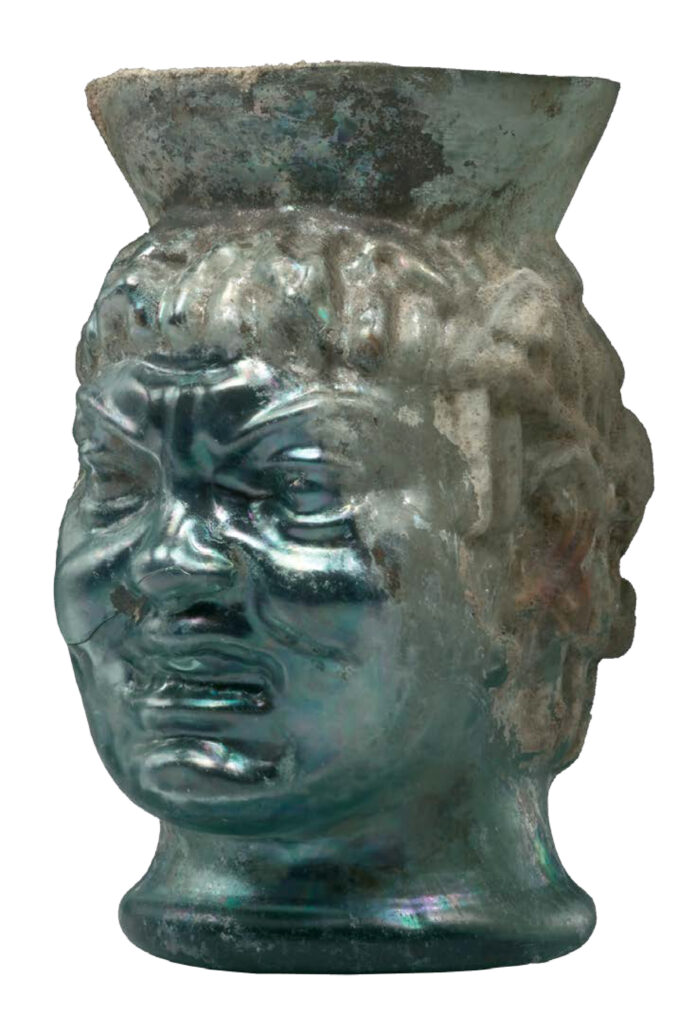 4. Gobelet en verre, transparent, à reflets bleutés. Il a été soufflé et moulé en trois parties: base, face et revers de la panse. Les raccords sont presque invisibles. La panse a la forme d’une tête, celle d’un jeune Africain, caractérisé par les traits négroïdes et la coiffure en mèches torsadées, qui tombe en frange sur le front.Ce vase, à ranger dans les produits de luxe, date de l’Empire romain. Dérivé d’un modèle oriental, il a probablement été exécuté en Italie, d’autres exemplaires ayant été trouvés à Herculanum et à Pompéi.