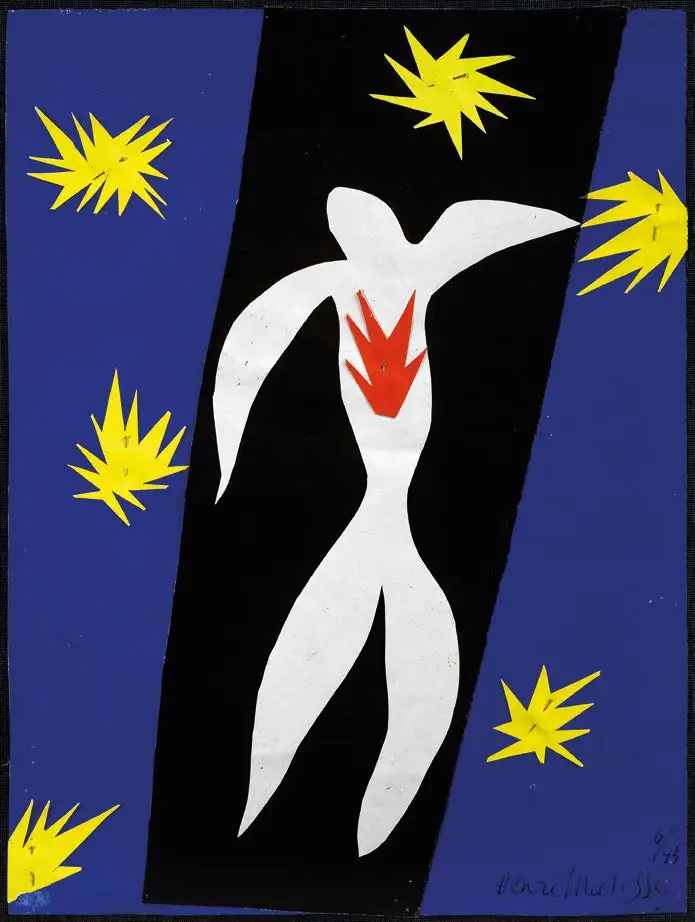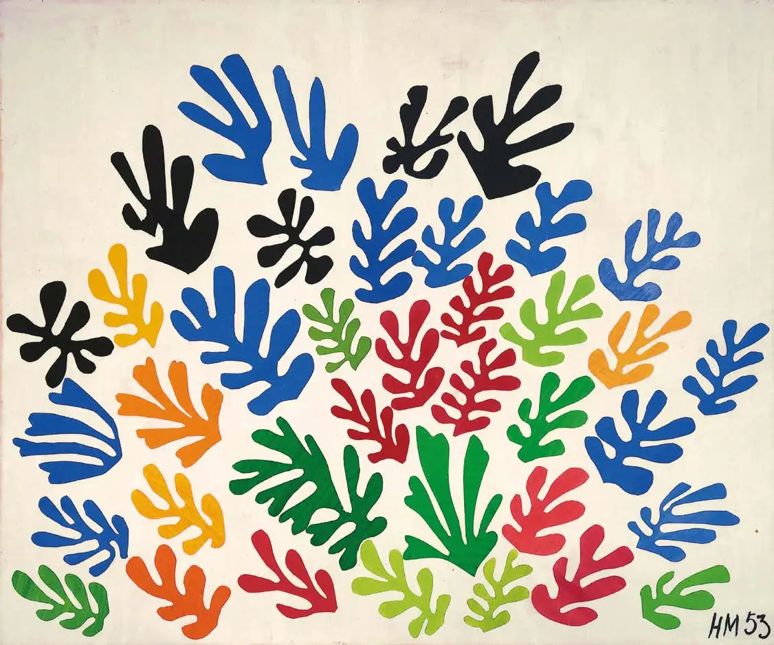 De retour à Nice, tout en menant ce chantier colossal, Matisse érige la gouache découpée en langage plastique autonome. Le début des années cinquante voit naître une série de merveilles. D’abord La Perruche et la Sirène, La Tristesse du roi, les célèbres Nus bleus, puis La Piscine, vaste environnement mural déployé sur les murs du Régina. Fusionnées aux formes de l’eau, les corps des danseuses convoquent la devise du peintre Martin Barré: «Au-delà du figuratif et de l’abstrait, il y a la peinture.» Les découpes, aussi simples que majestueuses, condensent l’expérience d’une vie entière.