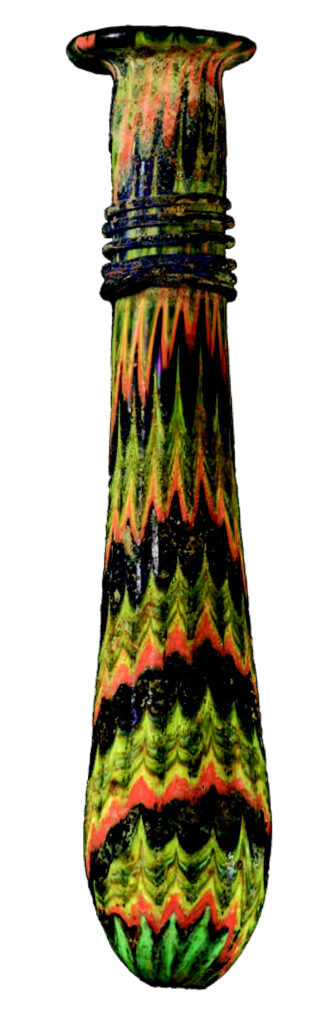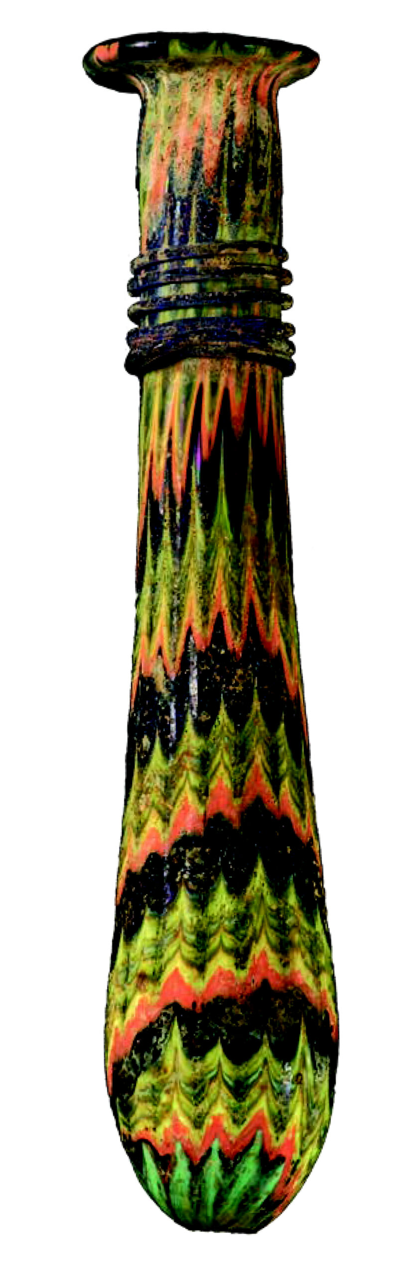 Lacrimatoire: petite fiole destinée à recevoir du parfum (sous forme huileuse) et non des larmes, comme le veut la croyance populaire. Les fioles tubulaires contenaient le kohl, poudre noire pour le maquillage des yeux.