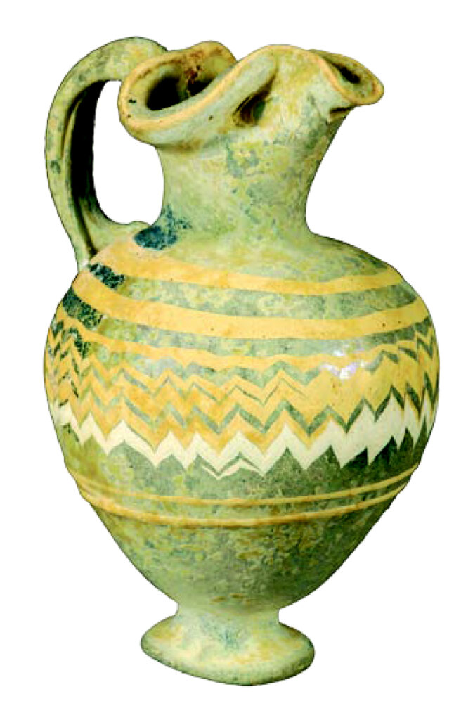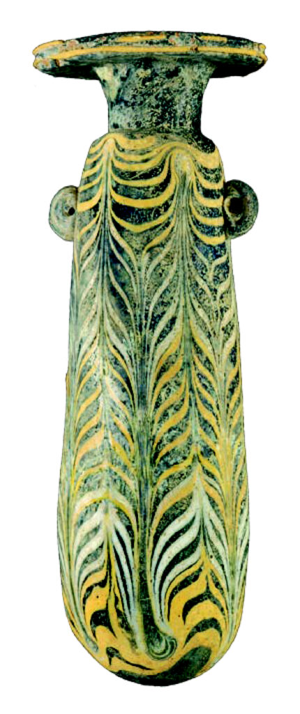 Soufflage: vers le milieu du Ier siècle av. J.-C., la technique du verre soufflé, à la volée ou dans un moule, provoqua un changement radical, car elle accélérait le rythme de production et abaissait le coût. (J.C.)