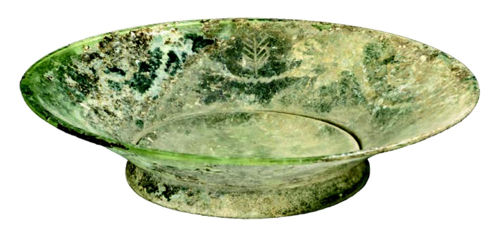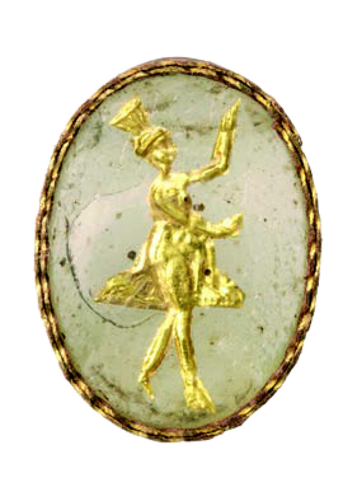 Or: à la fin du IIIe siècle ap. J.-C., les verriers romains ont utilisé de la feuille d’or, glissée entre deux couches de verre transparent, pour orner le fond des coupes.