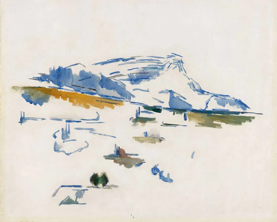 L’art de Cezanne ne cesse de se réinventer devant le motif, à l’image des plus de trente versions à l’huile – et des dizaines d’autres à l’aquarelle – de la montagne Sainte-Victoire. L’artiste peint avec constance ce motif dans la décennie 1885-1895 et entre 1902 et 1906, depuis la colline des Lauves, où la montagne présente son profil le plus spectaculaire; celui-ci suit le versant nord, s’élève lentement jusqu’à la crête, puis chute brutalement. Entre la montagne et les Lauves s’étend une vaste plaine, une mosaïque de champs entourés de murs, parsemés de bâtiments de ferme et de bosquets d’arbres. Si ces œuvres se ressemblent, elles ne se répètent jamais. Chaque paysage est peint depuis un point de vue légèrement différent ou selon un angle distinct; chacun met l’accent sur des composantes spécifiques du premier, du second ou de l’arrière-plan. La plupart de ces huiles et aquarelles paraissent transmettre la luminosité et l’atmosphère changeante de la vaste plaine même si Cezanne ne va pas aussi loin que les impressionnistes dans le rendu des variations atmosphériques. Ces œuvres traitent tout autant du même sujet inlassablement répété que de l’exaltation éprouvée par l’artiste à représenter cet immense espace centré sur la montagne, grandiose, une expérience qu’il n’a de cesse de renouveler. S’il exécute un grand nombre de versions d’un même motif, c’est moins dans un esprit de recherche obstinée que dans une tentative systématique de se rapprocher de sa vision. Le tableau est construit au moyen de taches de couleurs disposées de manière rythmique sans que ces dernières ne soient reliées entre elles par des lignes. De près, l’effet est celui d’une mosaïque de grandes taches – foncées ou claires, posées par coups de pinceaux parfois opaques, parfois translucides, verticaux, diagonaux ou horizontaux – frôlant l’abstraction. De loin, l’ensemble s’harmonise et évoque puissamment à la fois la largeur et la profondeur de la nature.