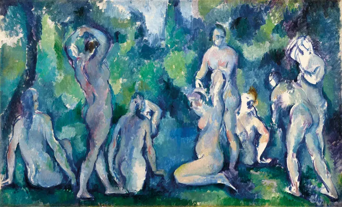 L’ambition rénovatrice de la peinture de Cezanne trouve son aboutissement dans les trois versions des Grandes Baigneuses, absentes de l’exposition. Cependant, le cheminement intellectuel et plastique du peintre est évoqué à travers plusieurs tableaux et aquarelles de baigneuses et de baigneurs. Ainsi, ils témoignent de l’exploration assidue de quelques-unes des multiples possibilités de construction de composition et d’agencement des nus dans le paysage. Ils rendent compte de l’étude patiente des relations entre l’être humain et la nature, mêlant étroitement les corps et le paysage, les fondant dans le rythme des arbres, les faisant épouser les berges sinueuses du fleuve ou surgir de terre comme des plantes.