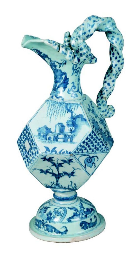 Mais le parcours de découvertes ne s’arrête pas là, car la faïence de Rouen se devait de renaître industriellement. Dominée durant un demi-siècle (1648- 1698) par le quasi-monopole de la famille Poterat , elle acquerra un prestige au moins égal. Qui dit l’art de Rouen voit le style du lambrequin rayonnant. Ses motifs abstraits, sorte de broderies baroques empruntées aux gravures des ornemanistes qui travaillaient à fournir des modèles à de nombreux artisans, brodeurs, décorateurs de palais et architectes de jardins, sont d’une géométrie rigoureuse et éclatante. Le nom d’un peintre se détache loin devant les autres, celui de Pierre Chapelle qui, dès l’âge de onze ans, tel un petit Mozart, a signé plusieurs pièces remarquables, dont les fameux Globe céleste et Globe terrestre du Musée de la Céramique de Rouen. Il savait dessiner, il savait peindre, il savait surtout écrire en rouge, la couleur tirée d’une terre ferrugineuse, très difficile à manier au pinceau. Et parmi les pièces de l’exposition, sa carte géographique de la France peinte sur un carreau avec une infinie précision mérite une attention particulière.Le lambrequin s’exhibe tour à tour sur des plats de toutes formes, des vases, des saupoudreuses, des plateaux, en sujet principal ou secondaire du décor, se combinant au fond d’ocre niellé, coûteux et raffiné. Lille reprendra et développera le décor des lambrequins dans une production de haute qualité.A la fin du siècle, le sud de la France jouera aussi un rôle de premier plan dans l’histoire de la faïence. Deux centres, dont l’histoire s’écrira en parallèle – les descendants des mêmes familles de potiers, les Clérissy, et de peintres, les Viry, y travailleront -, rivaliseront d’excellence et de créativité. Jospeh s’installera près de Marseille, à Saint-Jean-du-Désert, Pierre restera à Moustiers, mais la distinctionentre les deux productions n’est pas facile à faire. Qu’il s’agisse de copies de porcelaines de Chine, de scènes bibliques, pastorales, de chasses d’après Tempesta ou encore d’inspirations de l’œuvre de l’ornemaniste Jean 1er Berain (1640-1711), dessinateur de la chambre et du cabinet du roi, on les reconnaît à la douceur de leur bleu et du manganèse ou du seul camaïeu bleu.De chaque pièce, d’une qualité étonnante, émane une puissance ensoleillée et calme. C’est à ce point que l’on retourne aux valeurs essentielles de la nature, à cette densité de la terre, à sa légèreté ici, qui plongée dans l’onctuosité particulière de l’émail, témoigne de cette vibration millénaire. Un trait qui subsiste encore dans la production de Moustiers.Les édits du roi Soleil enjoignant la noblesse à fondre la vaisselle d’or et d’argent pour renflouer le Trésor auront renforcé le statut de la faïence qui se substituera à l’argenterie. En parallèle, la concurrence de la porcelaine chinoise aura incité les faïenciers français à raffiner leur pâte, leur émail et à diversifier leurs décors. Avant l’avènement de la polychromie de petit feu, mise au point au début du XVIIIe siècle pour affronter la multiplication des manufactures de porcelaine à Meissen et dans toute l’Europe, les talents du Grand Siècle auront été limités par la palette au grand feu. Mais quelle splendeur!