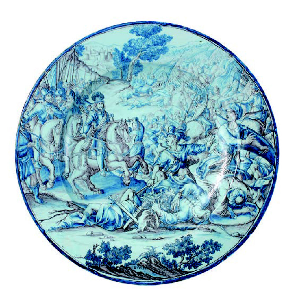 Décor de Gaspard Viry, inspiré d’une gravure d’Antonio Tempesta «Le Roi de Pologne chassant les Turcs»Collection Musée national de Céramique, MNC 3109