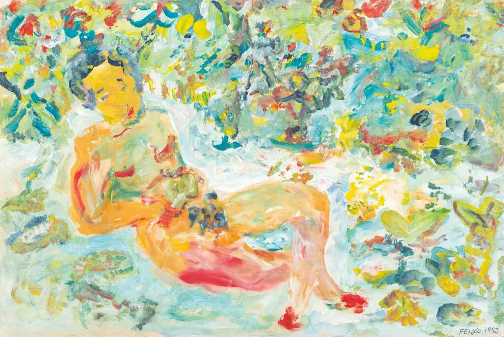 Au-delà des mythes indiens d’Amérique du Sud, malgaches ou hindous, transmutés par l’artiste, au-delà de la figure féminine – jamais souriante – qui l’obnubile, Ducreux voit chez Feijóo un « enchevêtrement presque étouffant » révélant, lorsqu’on s’y attarde, une foule de sens cachés, de paysages « dépourvus de ciels ou de perspectives, afin que le regard se perde dans le labyrinthe » de sa palette singulière – à la frontière du pastel – où le jade, le corail, le rose peau, le bleu torrent et le jaune soleil fusionnent par magie. Avant de rappeler que « ses peintures sont une réflexion permanente sur le sort et les origines de l’humanité ». Au-delà de l’huile cependant, il faudrait également mentionner, parmi ses médiums, le dessin, la gravure, l’aquarelle, la photographie même. Jusqu’à sa mort en 1992, cet éternel explorateur créa comme il voyagea : à la conquête – sensible – du monde.