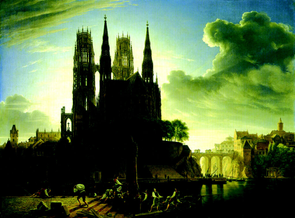 En tout cas, cette façon d’unir la géométrie et le rêve, la précision et la féerie, le distingue entre tous les architectes. Finalement, cette union est très logique, puisque c’est précisément celle du classicisme et du romantisme. Or, Schinkel appartient à cette période de transition qui, au début du XIXe siècle, participe de l’un et de l’autre. Son tableau intitulé Dôme au bord de l’eau est très symbolique à cet égard: cette cathédrale imaginaire, ciselure de pierre ajourée sur le ciel, parfait fantasme romantique, occupe la gauche et le centre de la toile. Mais àdroite, on voit un pont romain, un petit temple grec: romantisme et classicisme. On dira qu’entre les deux, la balance n’est pas égale. Ce n’est pas certain: une belle et vive lumière habite tout le tableau, c’est sur elle que se découpe la cathédrale; cette lumière, qu’est-ce d’autre que le classicisme, où flotte la dentelle de la nuit romantique?