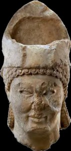 Le savoir technique y est souverain. Si le cimier cassé, dont il subsiste quelques traces sur le timbre du casque, était, en partie au moins, sculpté dans la masse (fig. 4), certaines mèches de la coiffure, à l’arrière, ont disparu, qui étaient travaillées à part avant d’être logées dans de longs canaux creusés verticalement : un fragment appartenant au réseau de ces mèches rapportées subsiste dans l’encoche horizontale taillée en retour derrière l’oreille (fig. 5). C’est là la marque de la virtuosité du maître sculpteur, comme de son désir d’accroître autant que possible, les effets qui décorent cet objet. Et de même que les accidents dont j’ai dressé plus haut le constat n’altèrent en rien la séduction qu’elle exerce, de même une telle maîtrise, n’offusque en aucune manière l’impression de jeunesse, de grâce naïve qui émane du style dela tête. Commeau temps où son créateur l’a fait naître, le sourire très discret qui éclaire doucement les traits (fig. 6) y fait toujours souffler cette brise du printemps archaïque que j’évoquais plus haut. Mais où et quand soufflait-elle ? Et d’abord, à qui attribuer ce visage, dont l’aménité attendrit la note guerrière qu’introduit le casque ?
