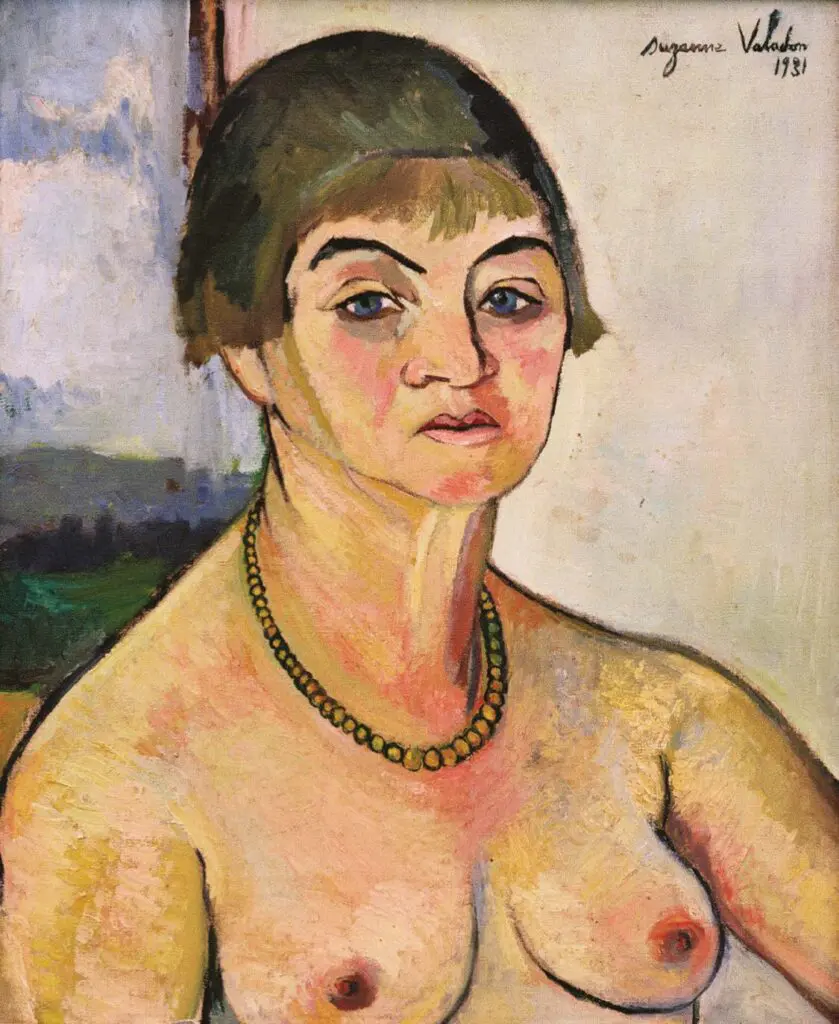 D’abord, Suzanne Valadon ne s’appelle pas Suzanne, mais Marie-Clémentine Valadon. Arrivée à Paris à cinq ans, en 1870 (pas le meilleur moment pour débarquer dans la capitale), la Limousine se rêve écuyère, trapéziste… Ce changement de nom traduit un changement de vie. Après la chute. Il faut se relever, être quelqu’un d’autre. Mais sans changer de visage. Et quand elle se peint, c’est sans se flatter. Ce ne sont pas nos jolis selfies arrangés à coups de filtres Instagram. Les traits de Valadon sont âpres, durs, pour reprendre des mots que Degas emploiera bien vite à son sujet. Ses narines sont un peu retroussées comme dans l’expression du dédain ; mais elle est ainsi faite. On dirait parfois que ce qui sort de notre bouche est moins dû à nos conceptions qu’à la conformation de cette dernière. Et l’on voit vite – comme dans son tardif Autoportrait aux seins nus de 1931 – que Valadon n’est pas taillée pour débiter des coquetteries ; c’est une affaire de sang, de race. « Il faut être dur avec soi, se regarder en face », écrit-elle : sévérité bien ordonnée commence par soi-même. Toulouse Lautrec lui donne ce nom de Suzanne, par allusion à l’épisode de la Bible où une jeune femme nue est reluquée par des vieillards.